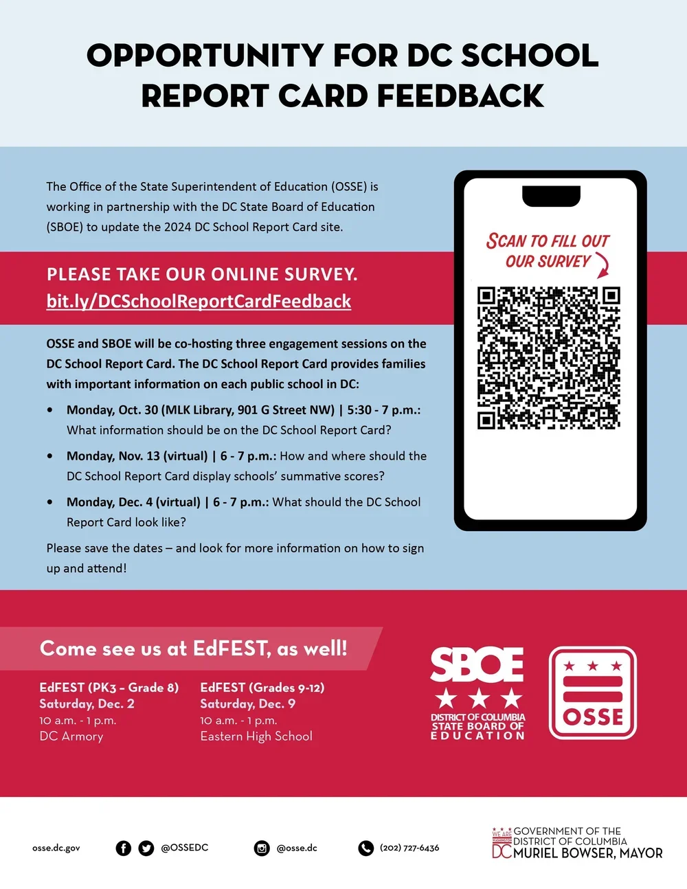 My DCSBOE colleagues and I are working with OSSE to update the 2024 DC School Report Card site. We’re looking for feedback and would appreciate your help to fill out this survey. We’re particularly curious to hear from constituents about what information they would like to see on the DC School Report Card website, as well as what information should be displayed most prominently.