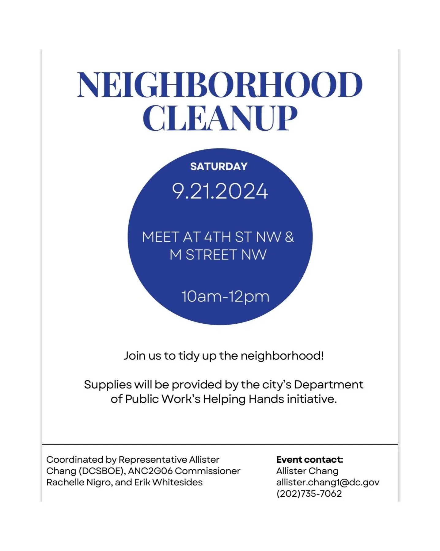I'm coordinating a trash pick-up in ANC2G with ANC2G06 Commissioner Rachelle Nigro. We will be starting at the intersection of 4th Street NW & M Street NW from 10 a.m. to noon. Supplies will be provided by DCDPW's Helping Hands Initiative. Please join us and/or help share with Ward 2 Neighbors!